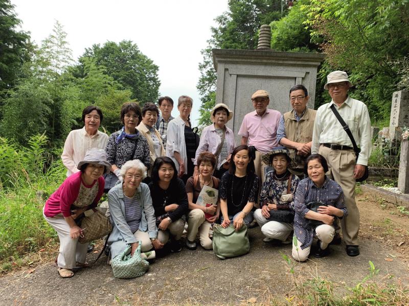 その次の写真は、翌日の「青畝ふるさと巡り吟行会」で青畝廟の前での写真。中央にしゃがんでおられます。