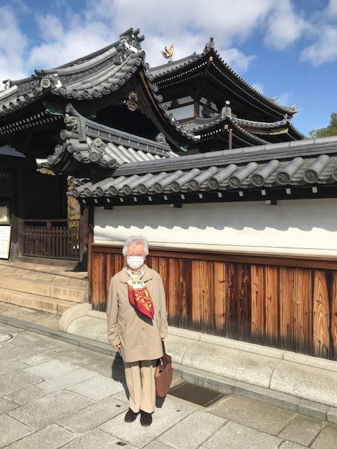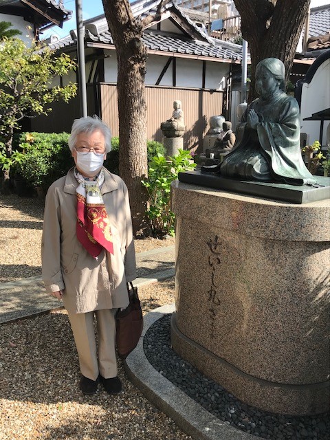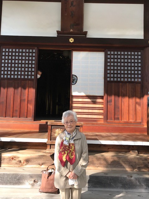 誌友の菅原好隆さんのお寺、甘露寺を背景にした写真の節子さんをご覧ください。