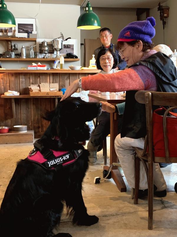 牧場の犬に馴れた手付きで遊ぶ葵さんです。